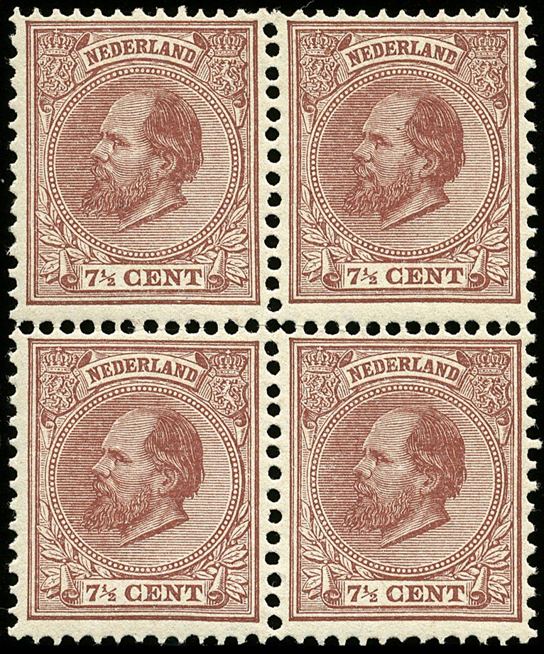 20, 7½ ct. chocoladebruin, postfris blok van vier € 1500