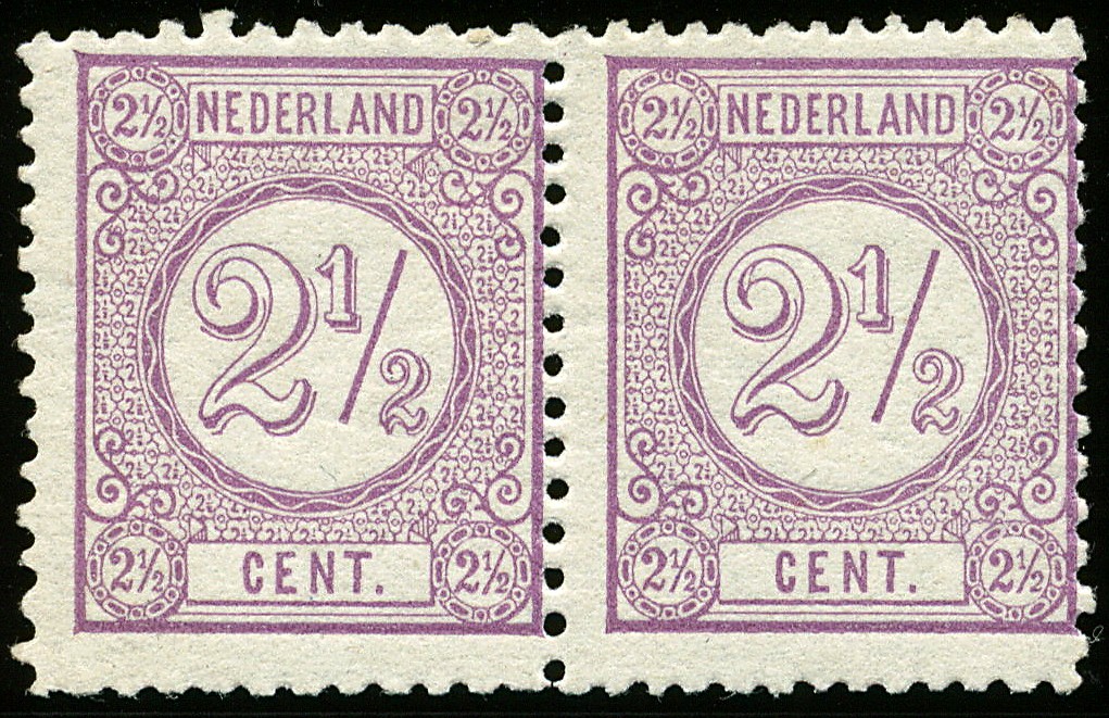 33D + 33C, 2½ cent lila in gecombineerde tanding, ongebruikt prachtpaar met volle, originele gom. € 650