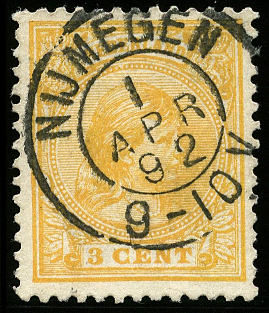 34, 3 cent oranje met luxe eerste dag-afstempeling Nijmegen 1-4-1892. Zeldzaam! € 550