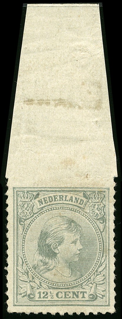 38v, 12½ cent lichtgrijs met variëteit ´Bovenzijde ongeperforeerd´, postfris vrijwel prachtzegel met wat vettige plakker op de rand. Zeldzaam! € 3500