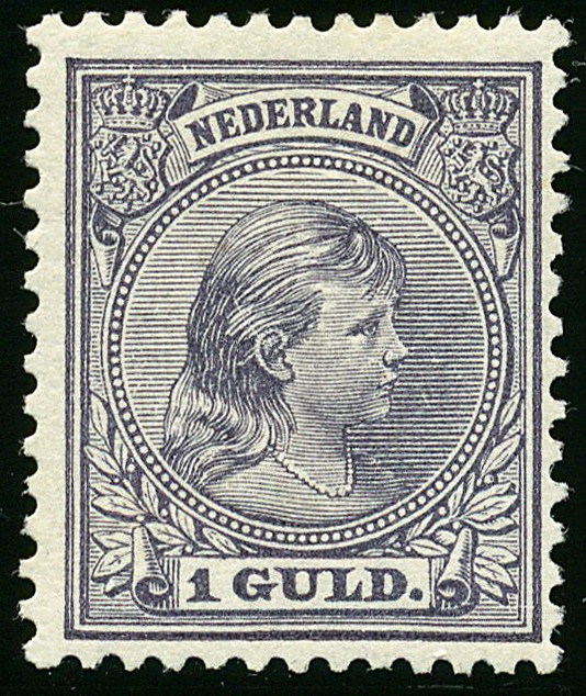 44, 1 gulden grijsviolet, ongebruikt, nagenoeg postfris prachtex. en alleen bij scheerlicht een miniem plakkerspoortje waarneembaar. € 1000