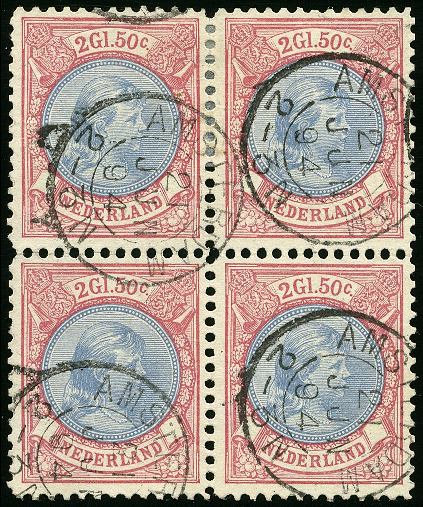 47A, 2½ gulden wijnrood en lichtblauw in gebruikt prachtblok van vier met cert. Vleeming (2016) € 1000