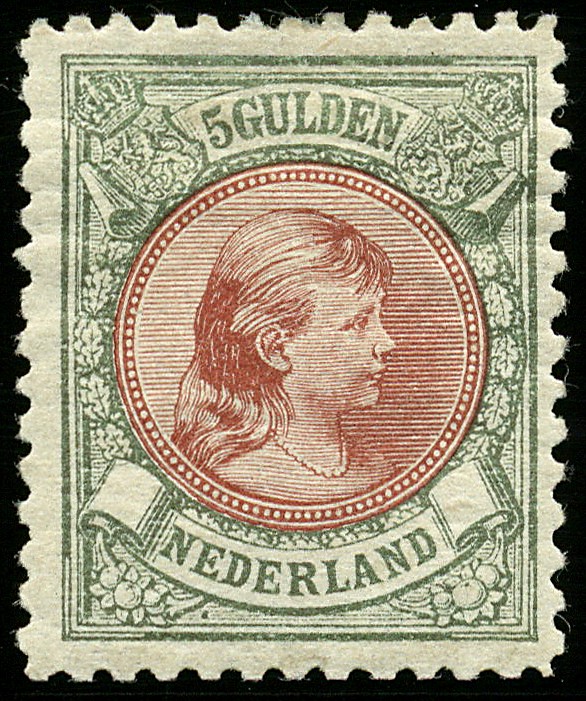 48, 5 gulden bronsgroen en roodbruin, ongebruikt prachtex., mooi gecentreerd en fris van kleur. Attest ´Moeijes, 1991´. € 1000