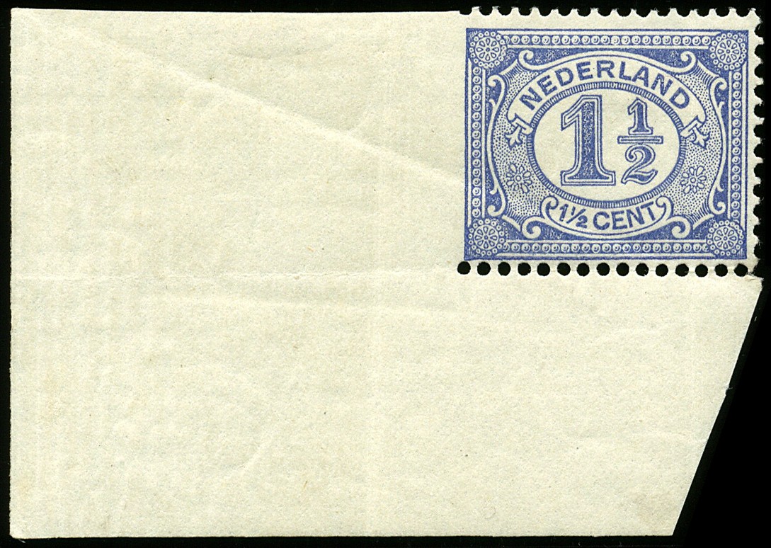 52v, 1½ cent Vürtheim ultramarijn met variëteit ´Linkerzijde ongeperforeerd´, ongebruikt vrijwel pracht hoekstuk (originele gomvouw). Keur ´van Dieten´. € 1800