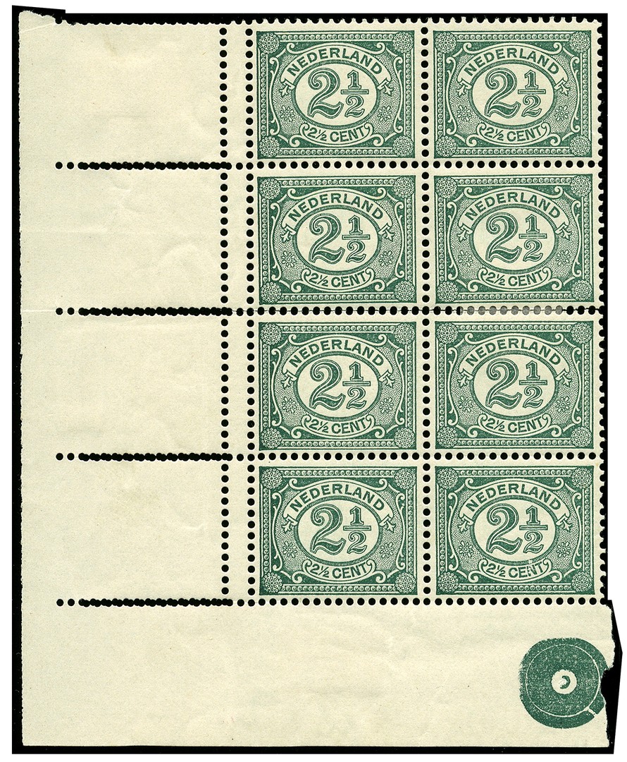 55, 2½ cent Vürtheim, ongebruikt hoekblok van acht, waarvan vijf ex. postfris, met variëteit ´Links van de linkerzegels dubbele perforatie, tevens dubbele horizontale perforatie in velrand = diamanttanding´. Zie: HPN A8-259/280 en daaruit afb. 555