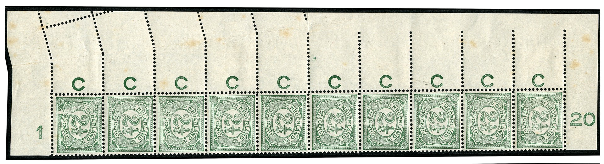 55, 2½ cent Vürtheim, postfrisse randstrip van tien (velrand bevestigd aan zwart kartonpapier) waarbij de rechter helft van de zegels door een of andere reden, bv. een onderliggend vel, zwaarder bedrukt is dan de linker helft. Tevens heeft de velrand een vouw waardoor een perforatievariant is ontstaan. Curieus!