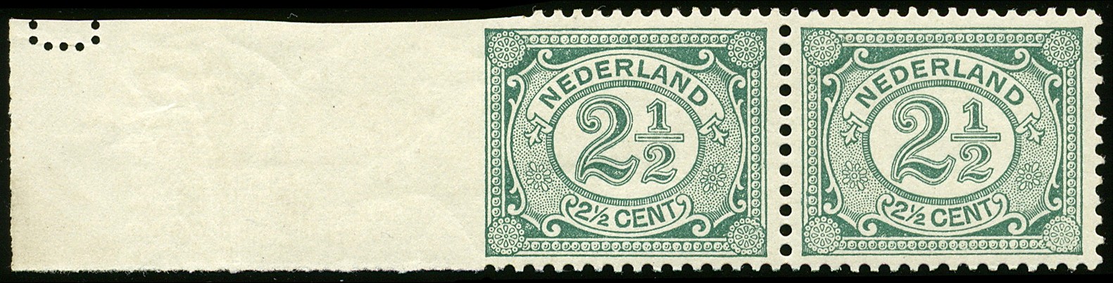 55v, 2½ cent Vürtheim met variëteit ´Linkerzijde ongeperforeerd´, ongebruikt vrijwel pracht randpaar. € 600