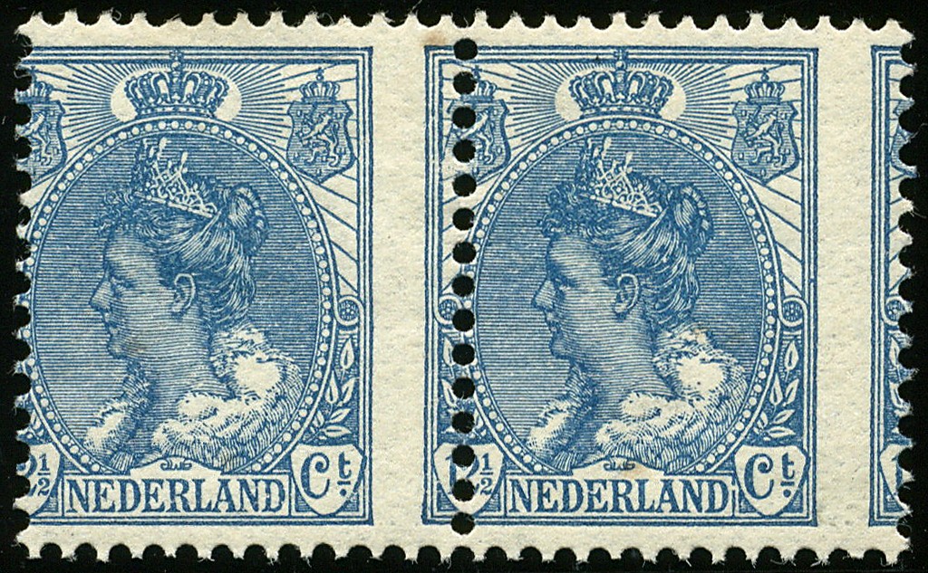 63, 12½ cent Bontkraag, ongebruikt los ex. en paar met variëteit ´Verschoven verticale perforatie´. Zie: HPN A9-253, afb. 547