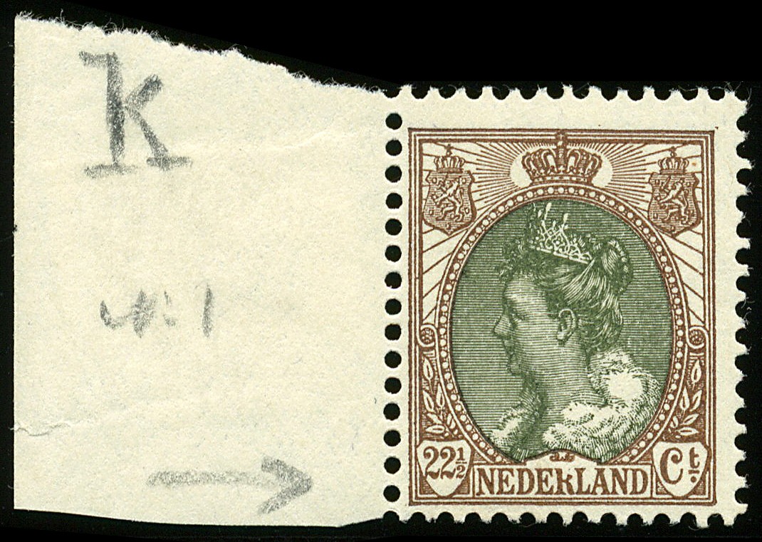 70P, 22½ cent Bontkraag met plaatfout ´Gedeelte R van Nederland ontbreekt´, postfris pracht randstuk. € 400