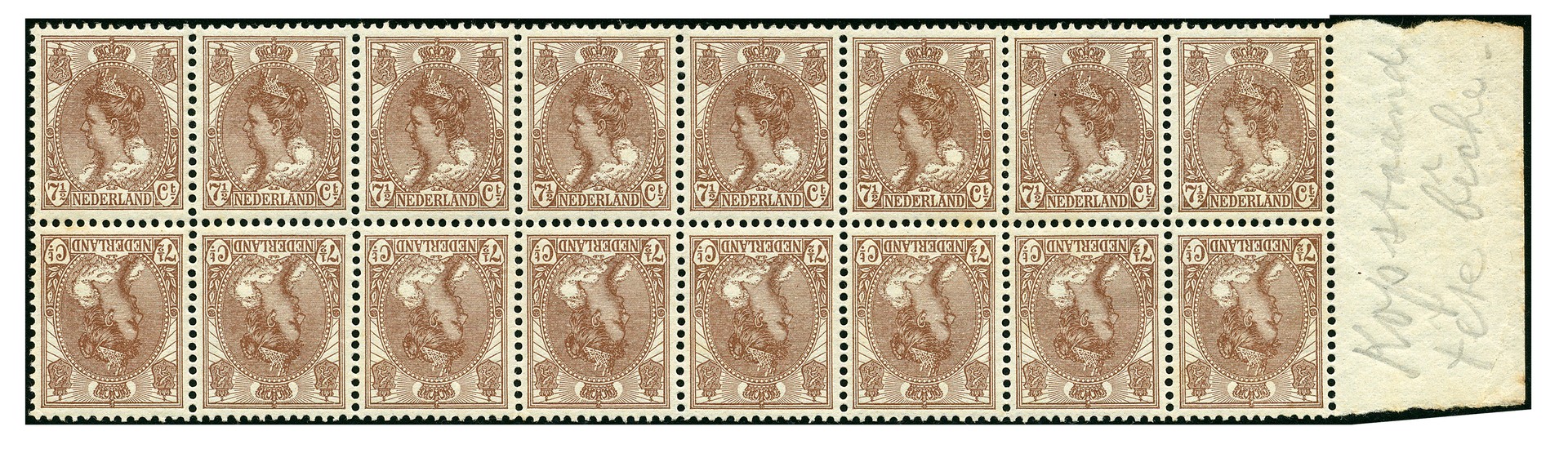 61b, 7½ cent Bontkraag als keerdruk in postfris veldeel van acht paren met velrand. € 1200