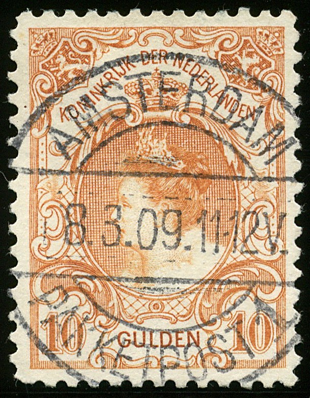 80, 10 gulden oranje, gebruikt prachtex. met volledig LB-stempel "Amsterdam/Pakketpost 1/8.3.09 € 750