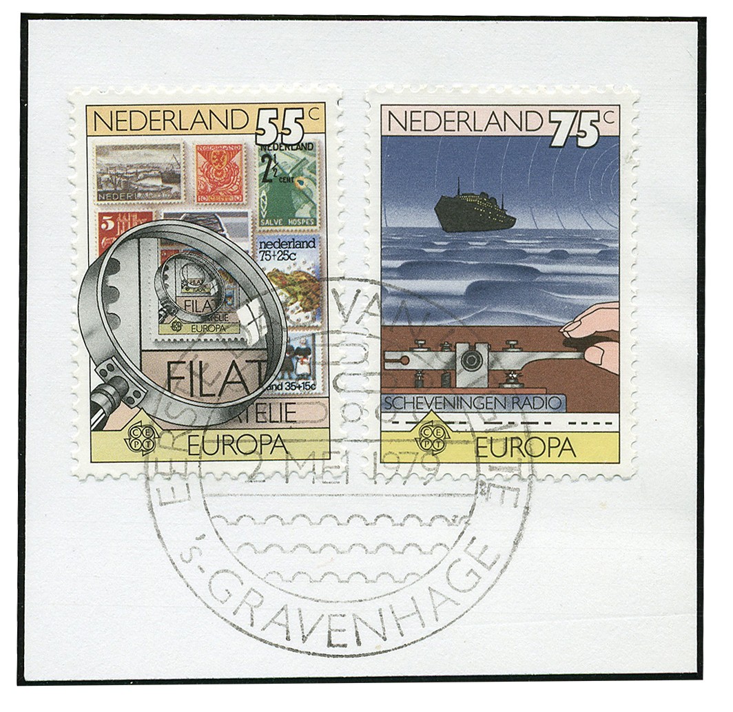 1179P, 55 cent Europa met plaatfout ´Gele vlek´ op verschillende locaties nabij de molenas, postfris in samenhang met normale ex. (twee blokken van vier, hoekblok van twaalf), alsmede gebruikt ex. op briefstukje. Ca. € 925