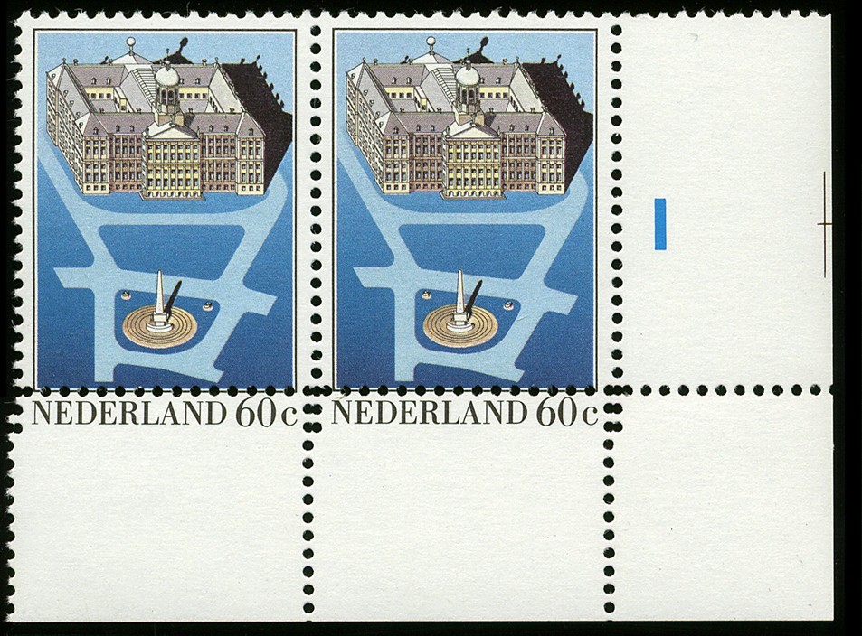 1274, 60 cent Paleis op de Dam 1982 in postfris hoekpaar met variëteit ´Perforatiefout onder de zegel waardoor ¨Nederland¨ buiten de zegel valt en de tanding iets verspringt´