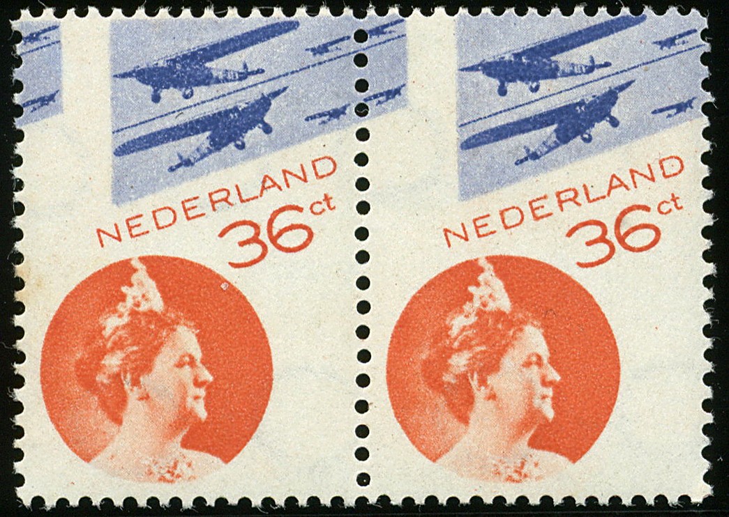 9f, 36 cent Fotomontage, drie paren (2 postfris, 1 ongebruikt), twee losse zegels (1 postfris, 1 ongebruikt) en 3 losse gebruikte zegels, alle met variëteit ´Sterk verschoven blauwe druk´, hetzij naar rechts, naar links of naar boven. Voor afgebeelde paar cert. ´Bakker, 1999´
