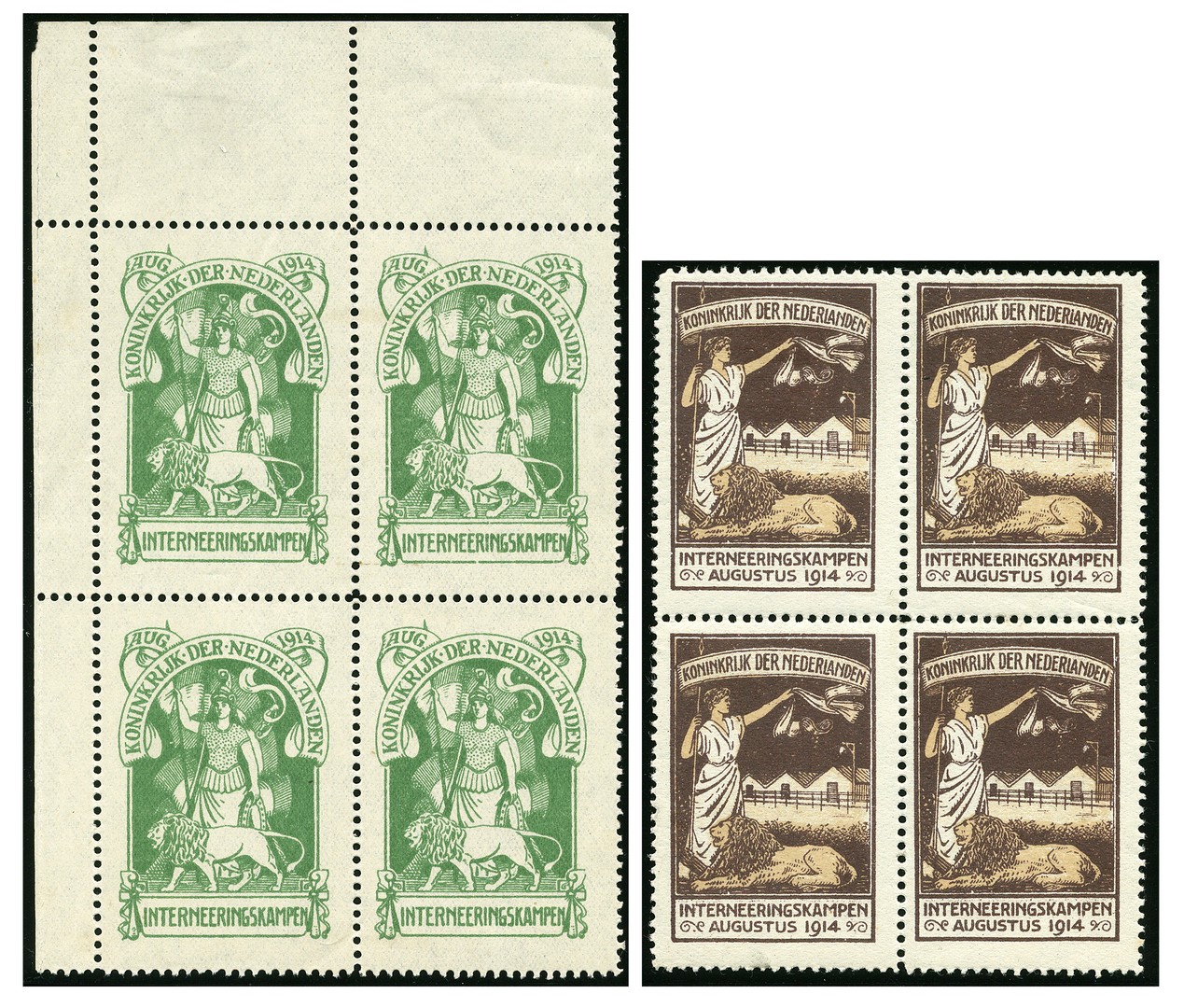 1 en 2, postfris vrijwel pracht hoekblok van vier (plakker op velrand, 2 ex. minieme kreukjes) resp. ongebruikt prachtblok van vier (onderste ex. postfris). € 2350