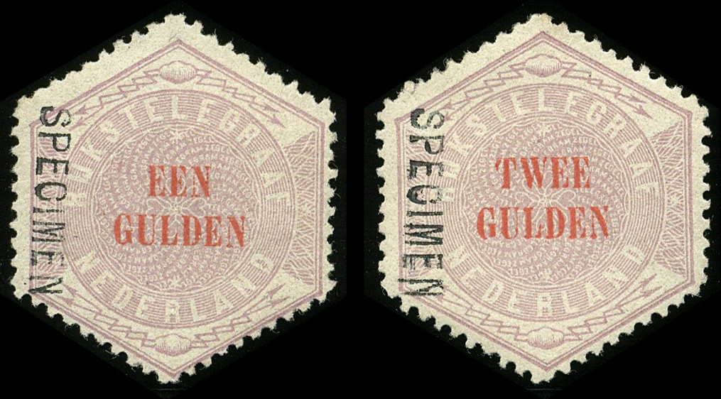 1/6, 8/12, 1 cent t/m 2 gulden met opdruk SPECIMEN (uitgezonderd 25 cent, die deze opdruk niet heeft gekregen), prachtset, die niet vaak wordt aangeboden! € 1750