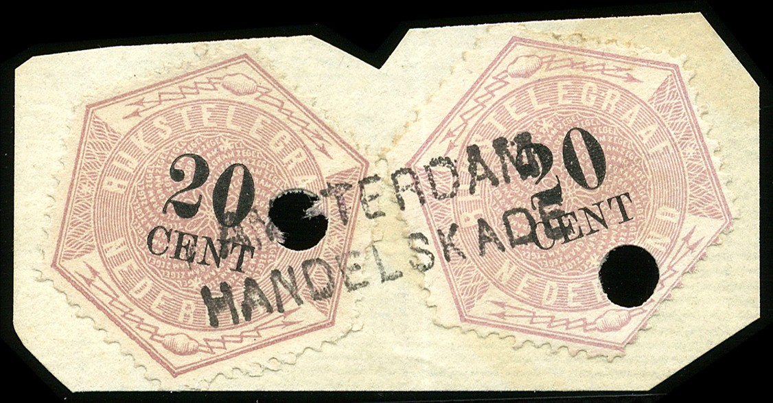 3, 5 cent (fraai ex. met gerepareerde scheur) op ´quitantie´ van een telegram, verzonden naar Den Haag, prachtig afgest. te Grouw 5-1-1915 (met cert. ´NVPH, 1997´), alsmede 5 cent (prachtex.) op knipsel, afgest. Blaricum 3-2-1920 en twee ex. van 20 cent op knipsel, met ponsgat en naamstempel Amsterdam/Handelskade.