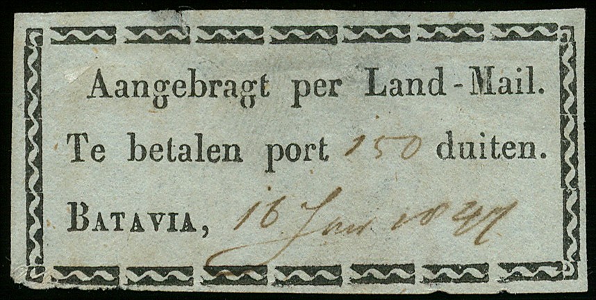 Landmailzegel II, waarde-aanduiding in Duiten, 'Te en Batavia recht onder elkaar', zeer fraai ex. € 1000