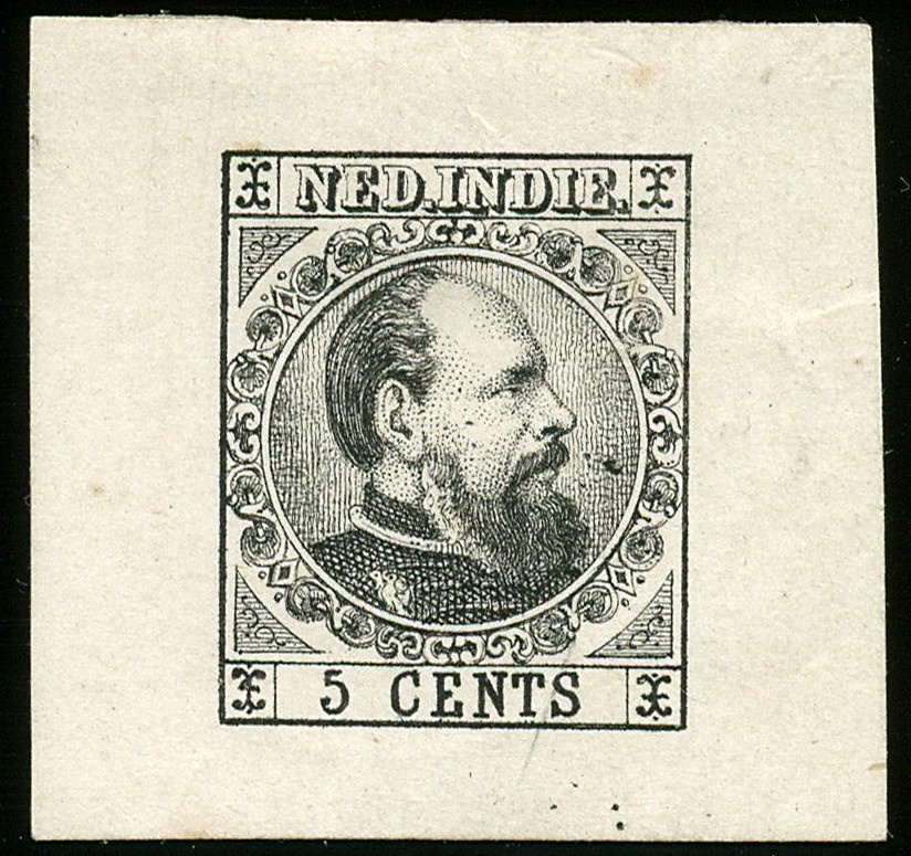 PC6, ontwerp voor de eerste postzegel van Nederlands Indië met afbeelding Koning Willem III naar rechts kijkend in het uniform van de Rijdende Artillerie met waardeaangifte 5 cent in zwart, op wit karton, prachtex. (enkele minieme kreukjes buiten zegelbeeld) met certificaat Vleeming (2019). Deze proef werd samenhangend in een velletje met proeven Pc nr.27A en PC nr.97 van Nederland gedrukt en helaas zijn deze allen los geknipt, slechts 3 ex. bekend