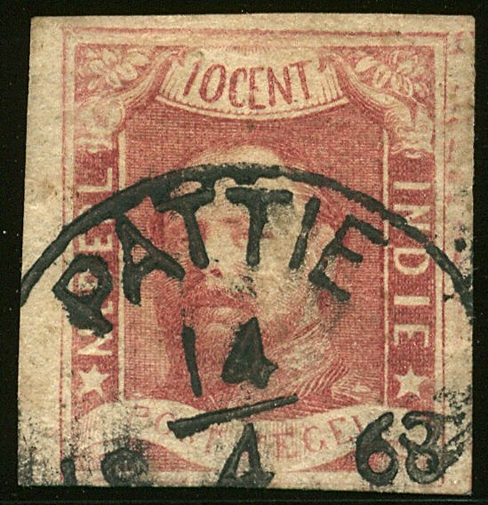 1, 10 cent wijnrood, aan twee zijden zeer breed gerand gebruikt prachtex. € 125