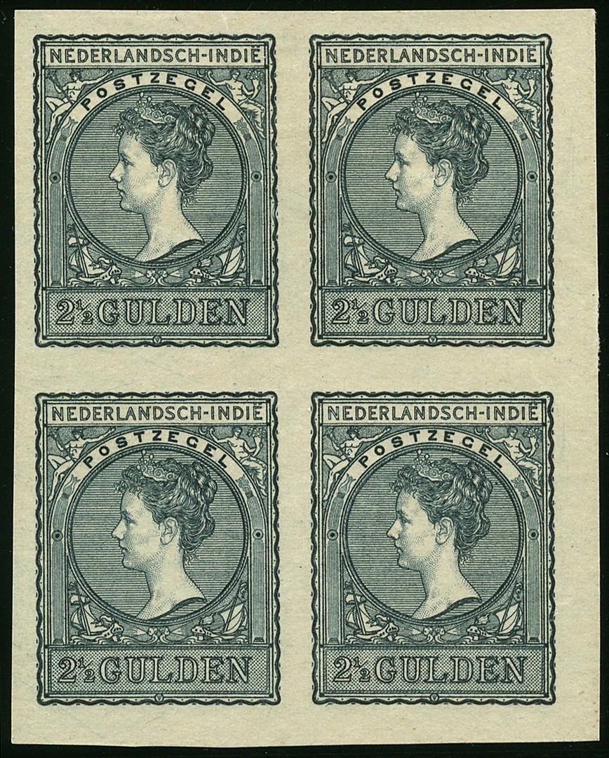 PC.48/49, 1 en 2½ Gulden type Veth, uitgifte 1906-1908, kleurproeven van de plaat in de gekozen kleuren, ongetand, ongegomd, in prachtblokken van vier. Zeldzaam! Fl. 800