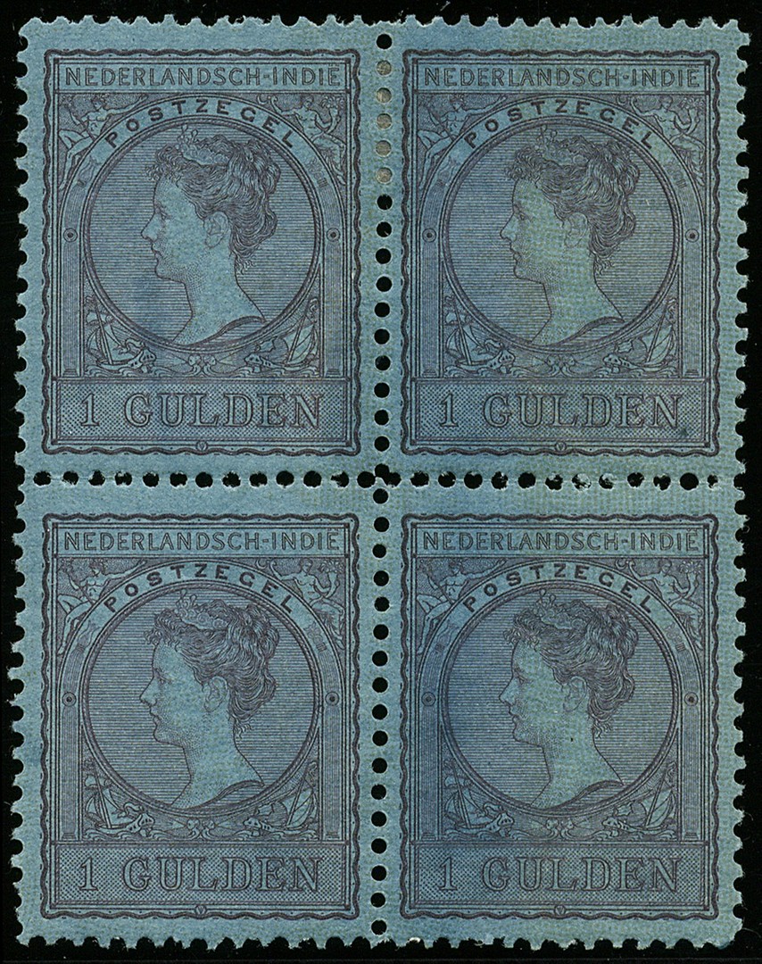 60A, 1 Gulden doflila op blauw in Lt. 11, ongebruikt prachtblok van vier. € 300