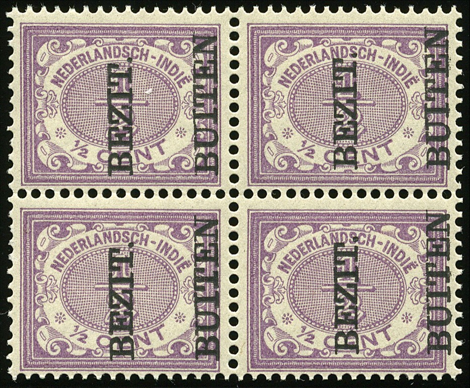 81fb, ½ cent lila met sterk verschoven opdruk Bezit Buiten, in luxe postfris blok van vier € 300++