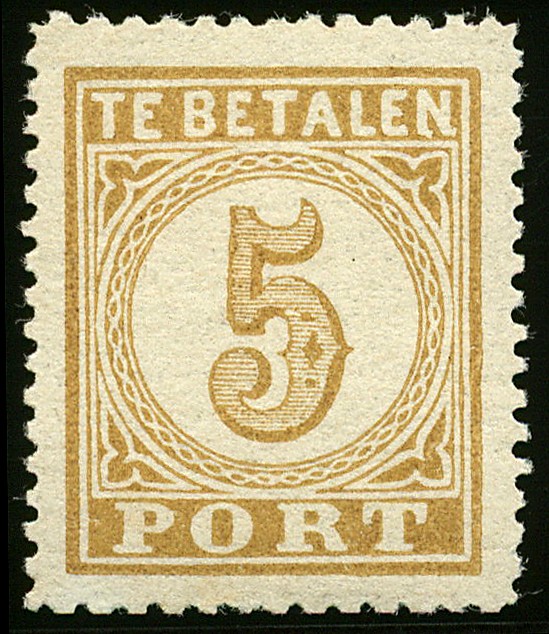 Port 1A, 5 cent bruingeel Kt. 13½ x 14 kl.g., postfris prachtex., origineel puntje in papier, goed getand en gecentreerd met cert. Vleeming (2019) € 950
