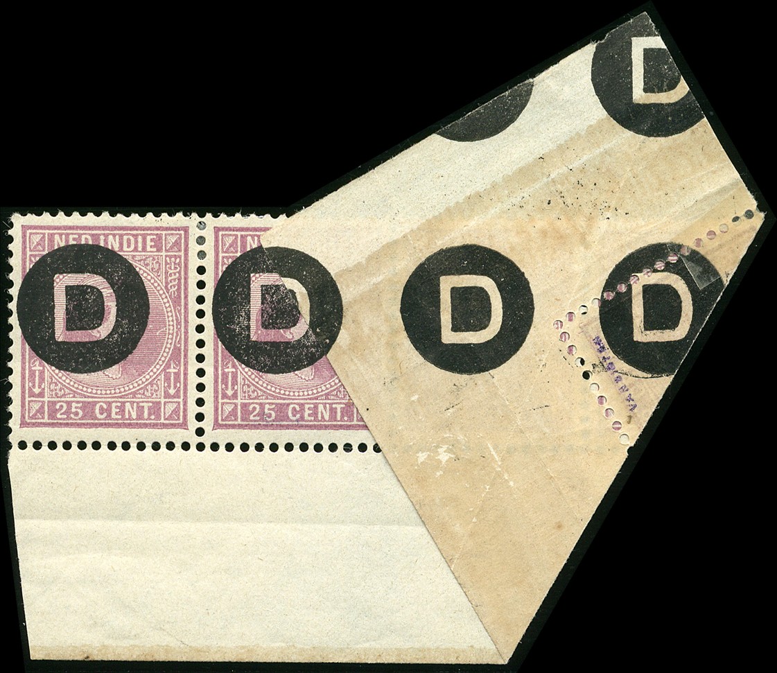 Dienst 5, 25 cent in hoekstrip van vier, gevouwen, waarna bedrukt met machine-opdruk D, ongebruikt, met op drie ex. keurstempeltje ´Van Dieten´. Aantrekkelijk stuk voor uw Indië-collectie!