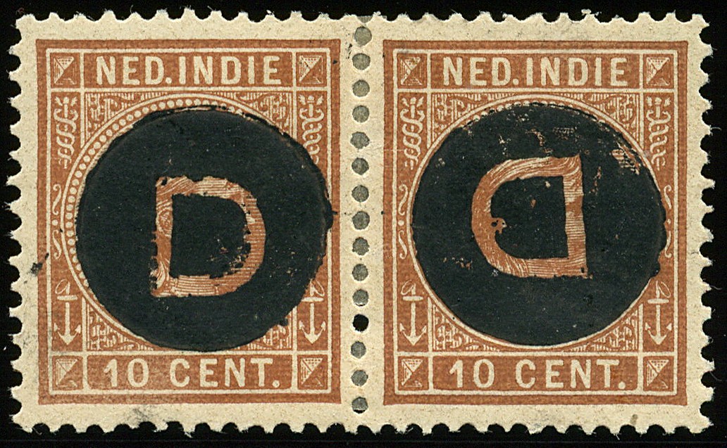 Dienst 1h-1hf, 10 cent roodbruin met handstempel-opdruk in horizontaal paar waarvan het rechter exemplaar met opdruk kopstaand. Ongebruikt zeldzaam prachtpaar met certificaat Moeijes (1990) € 435++