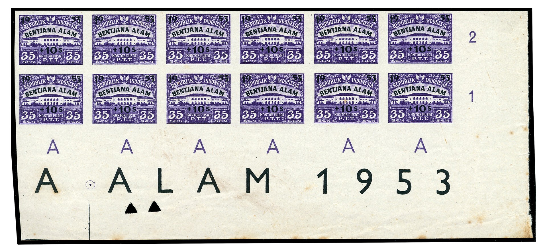 KPI.117A, Natuurrampenfonds 1953, ongetand en ongegomd, hoekblok van twaalf (velrand iets roest). Rp. 3.600.000