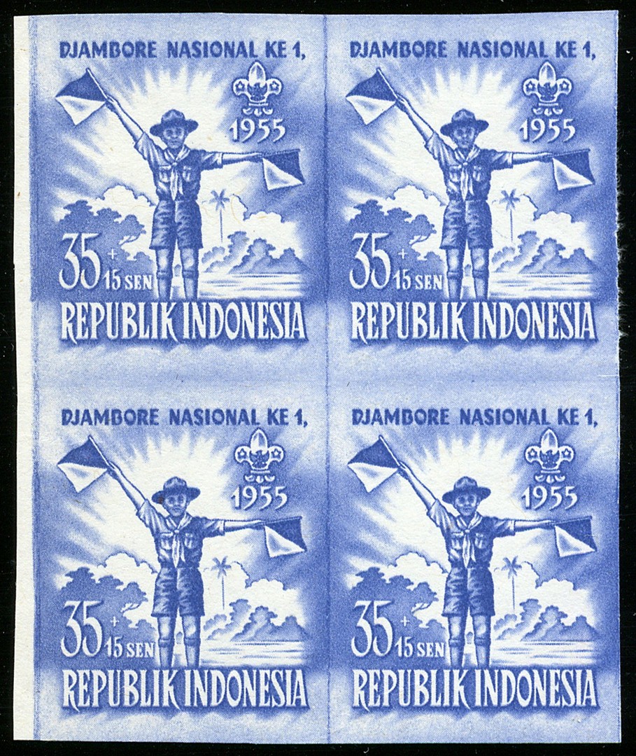 KPI.137A/141A, Eerste Nationale Jamboree 1955 en KPI.200A/203A, Dag van de Samenwerking 1957, ongetand en ongegomd in blokken van vier. Attest ´Vleeming´ voor 1955, Rp.36.000.000