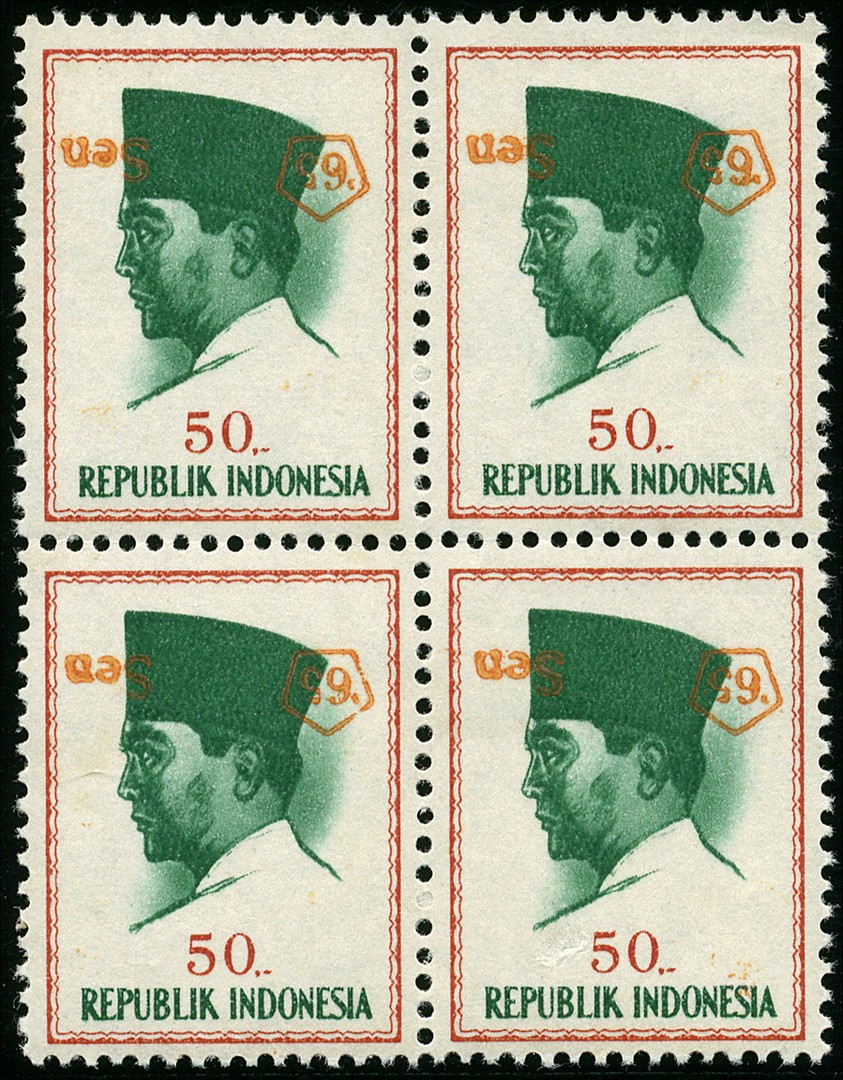 KPI.504b, 506b/510b, president Soekarno met variëteit ´Kopstaande opdruk 65 in vijfhoek en Sen´ in postfrisse blokken van vier. Rp. 6.800.000