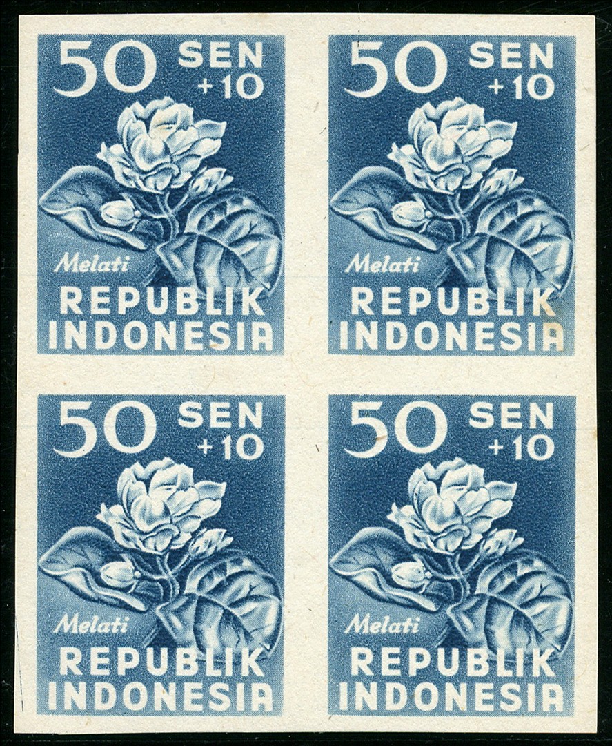KPI.CP33B, 33Ca (2x), 33D en 33Eb, kleurproeven Bloemen 1957, ongetand en ongegomd, blokken van vier. Rp. 44.800.000