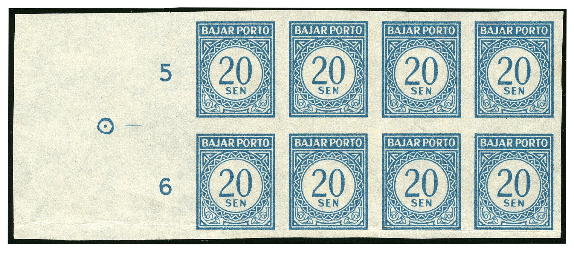PORTO ´51, KPI.P-2.5/7/8/9/13w, 5s, 15s, 20s, 25s en 1Rp in geelachtig groen, maar ongetand en ongegomd, in blokken van acht of vier (1Rp) w.o. met velrand. Op de 5s na hebben alle blokken een vouw door vier zegels. Schaars en niet gecatalogiseerd