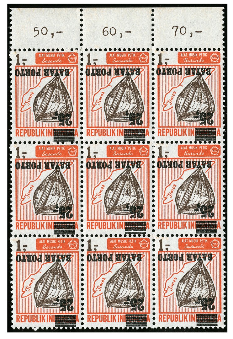 Zbl. P67, 25 op 1 Rp. rood met kopstaande, zwarte opdruk in postfris blok van negen. Niet in Zonnebloem vermeld. Tax. 100