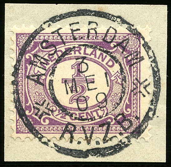 Grootrond AMSTERDAM/R.V.Z.B. met datum 3 mei 09 op ½c nr. 50. Prachtex. op briefstukje met luxe afdruk van dit uiterst zeldzame stempel
