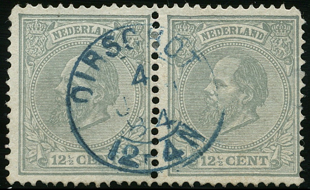 OIRSCHOT (hpk) in blauw op 12½c nr. 22. Vrijwel prachtpaar (rechtsboven mist hoektandje) met volledige, centrale afst.