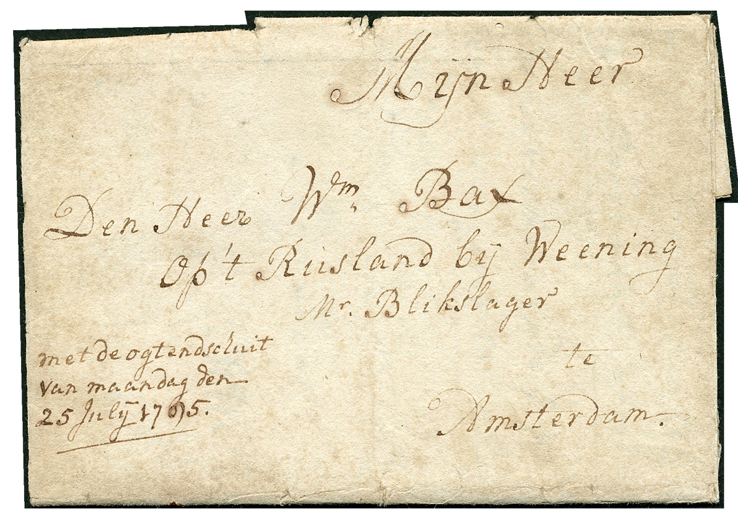 Vier schuitbrieven. Van Roosendaal naar Amsterdam (25-7-1785, PEP1.bv.Brt, brief iets gehavend), met de ´Utrechtschen middag schuyt´ naar Loenen (21-6-1818), van Amsterdam naar Loenen (rouwbrief 30-6-1819) en van Amsterdam ´per Pakschuijt´ naar ´s Hage (11-10-1847)
