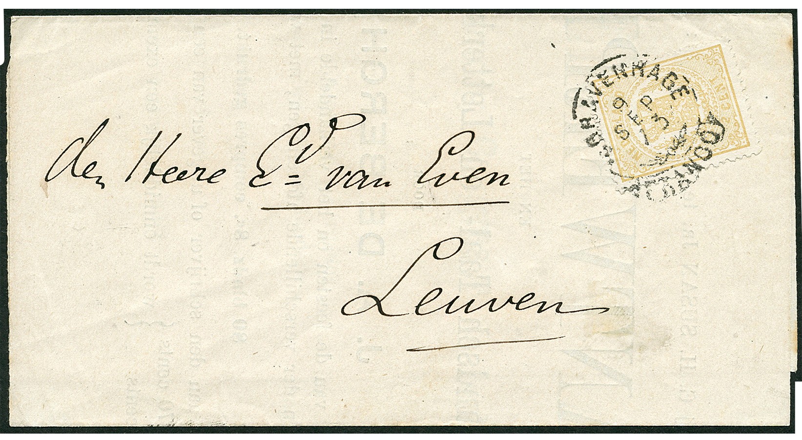 2 Cent Rijkswapen nr. 17C volgens tarief voor drukwerk naar België op cpl. drukwerk geplakt, van ´sGravenhage 9-9-1873 (franco-takje) naar Leuven (az. bestellerstempel 2 in cirkel). Zeer zeldzaam tarief van voor de oprichting van de UPU. Ons geen tweede vergelijkbaar poststuk met deze frankering bekend!