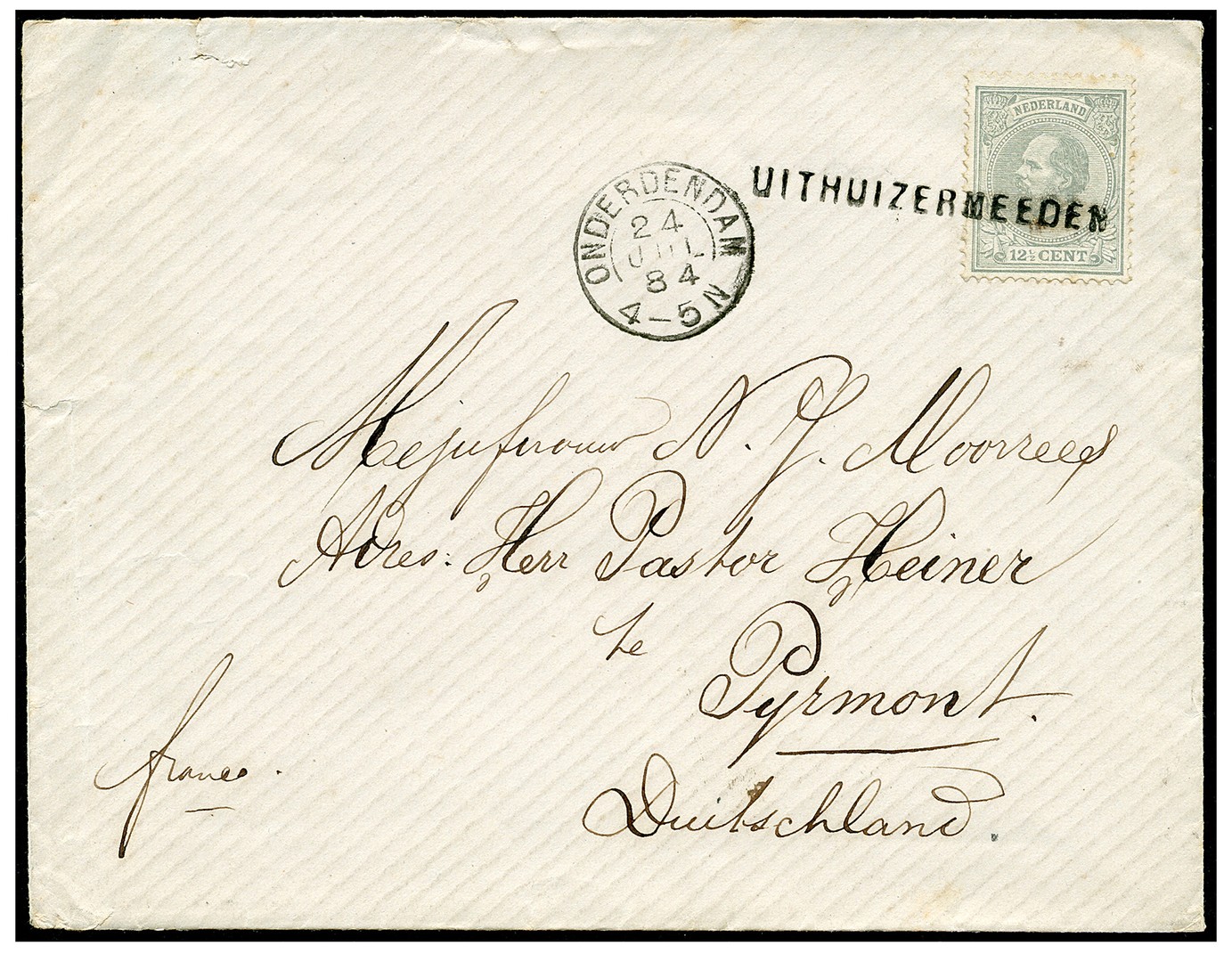 Env. (az. rechts iets ruw geopend) gefr. met 12½c keurig afgest. met naamstempel UITHUIZERMEEDEN via Onderdendam 24-7-1884 naar een mejuffrouw aan het adres van een pastoor te Pyrmont, kuurstadje in Duitsland