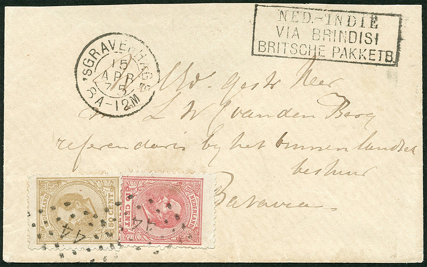 10 Cent nr. 21D en 50c nr. 27D op frisse envelop (klep ontbreekt) van ´sGravenhage 15-4-1875 per landmail via Brindisi met een Britse pakketboot (prachtige afdruk routestempel) naar Weltevreden 20-6. Tarief 60 cent, zie: HPN, Tarieflijst D 10