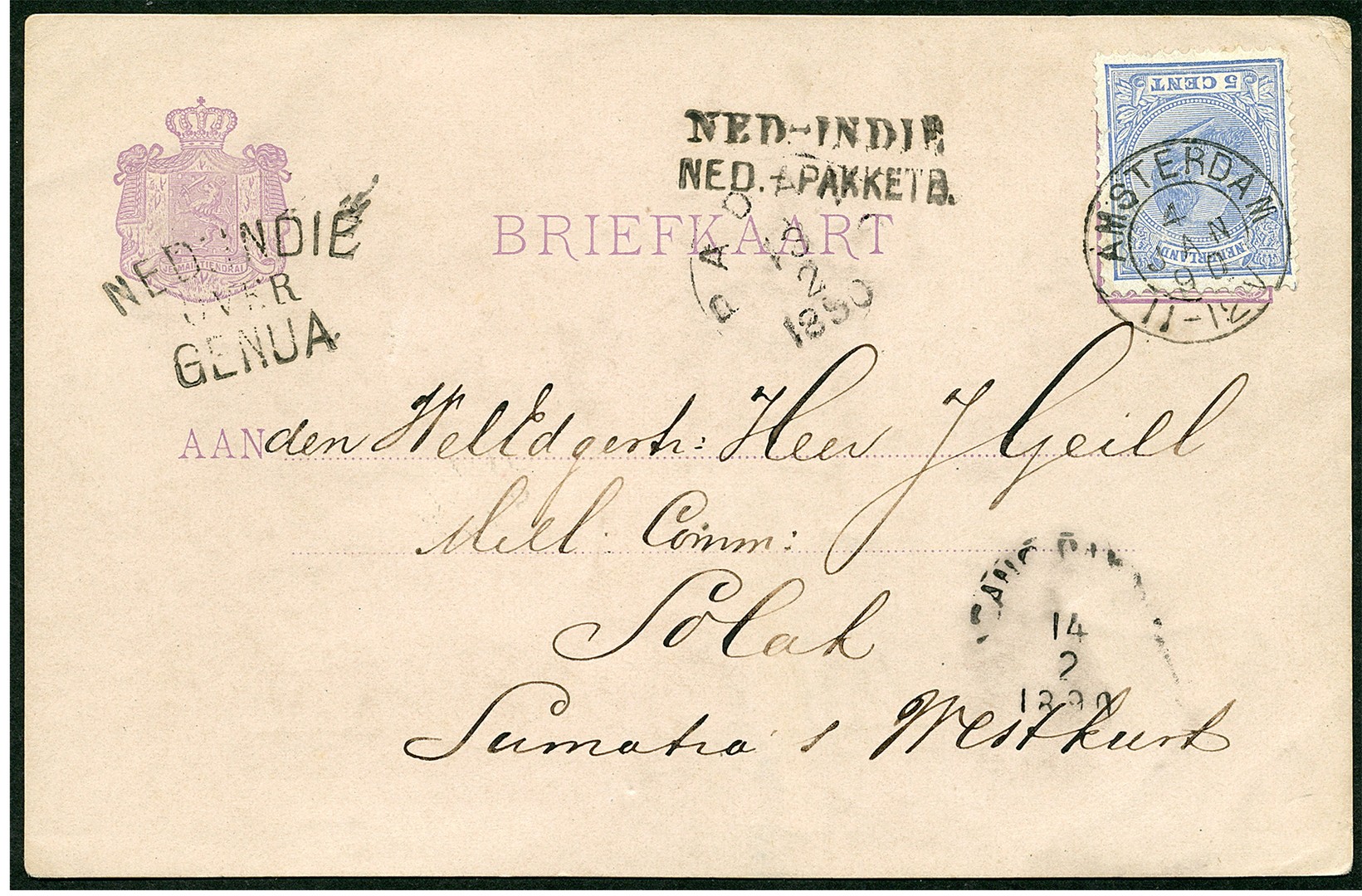 5 Cent nr. 19L geplakt op zegelbeeld van bk. van 2½c van Amsterdam 4-1-1890 met de Nederlandse pakketboot over Genua (twee routestempels) via Padang 13-2 en Padang Pandjang 14-2 naar Solok