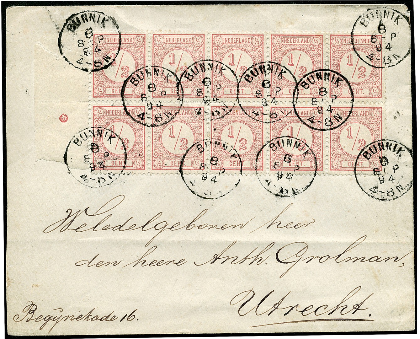 Randblok van 10 zegels van ½c nr. 30FII op env. van Bunnik 8-9-1894 naar Utrecht 8-9