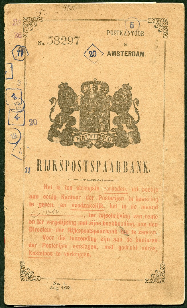 Compleet spaarbankboekje (getint en opnieuw geniet) met 11x kleinrond AMSTERDAM/R.P.S.B. 7-5-1894/19-5-1897 en 9x grootrond AMSTERDAM/R.P.S.B. 21-1-1898/29-12-1908. Schaars!