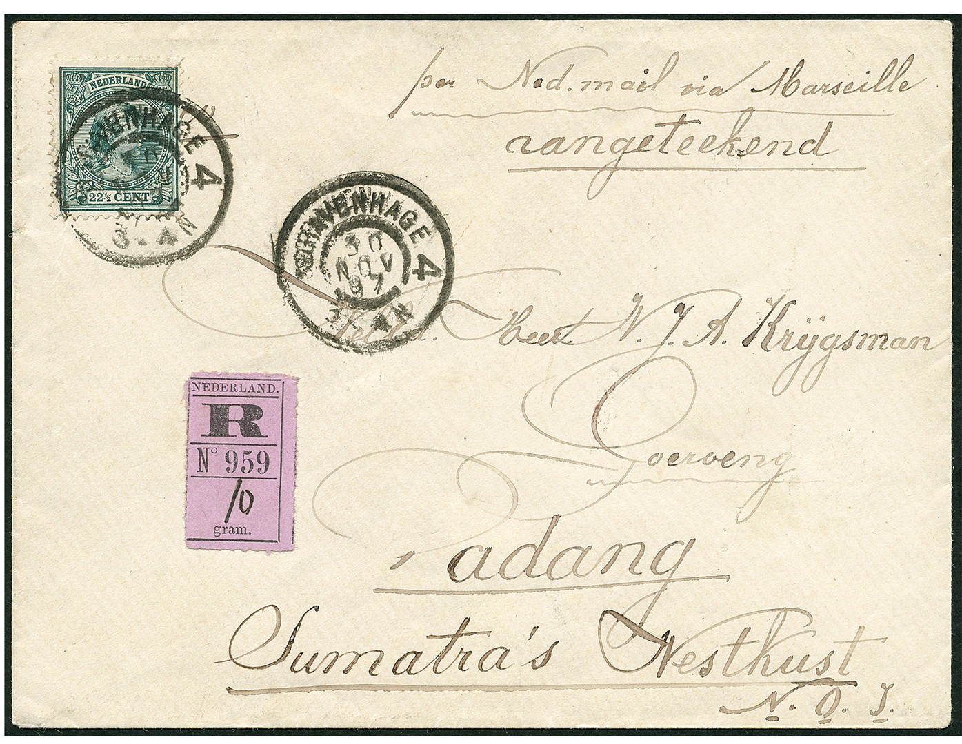 22½ Cent Hangend Haar als enkelfrankering op frisse envelop van ´sGravenhage 4 (= van Galenstraat, grootrond) 30-11-1897 ´per Ned. mail via Marseille´ naar Goeroeng via Padang 27-12