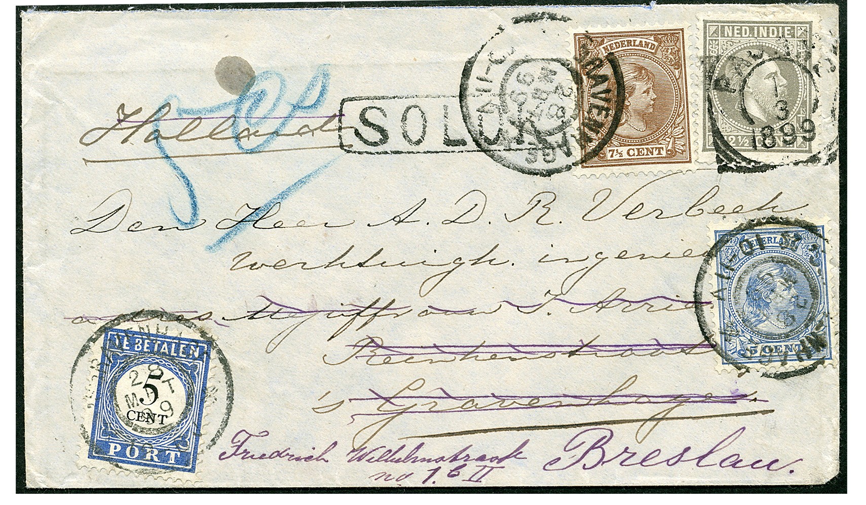 Env. uit Indië ontoereikend gefr. met 12½c van SOLOK over Padang 1-3-1899 naar ´sGravenhage, daar op 28-3 met 5c beport, opnieuw gefr. met 5c en 7½c Hangend Haar doorgez. naar Breslau 29-3