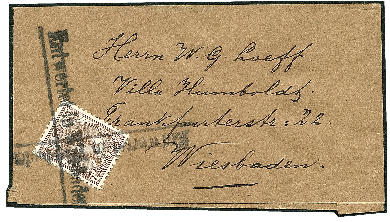 Omslagbandje gefr. met 7½c Bontkraag naar Wiesbaden, bij vertrek onafgestempeld gebleven en bij aankomst 2x afgest. ´Entwertet in Wiesbaden´. Ex Van der Willigen