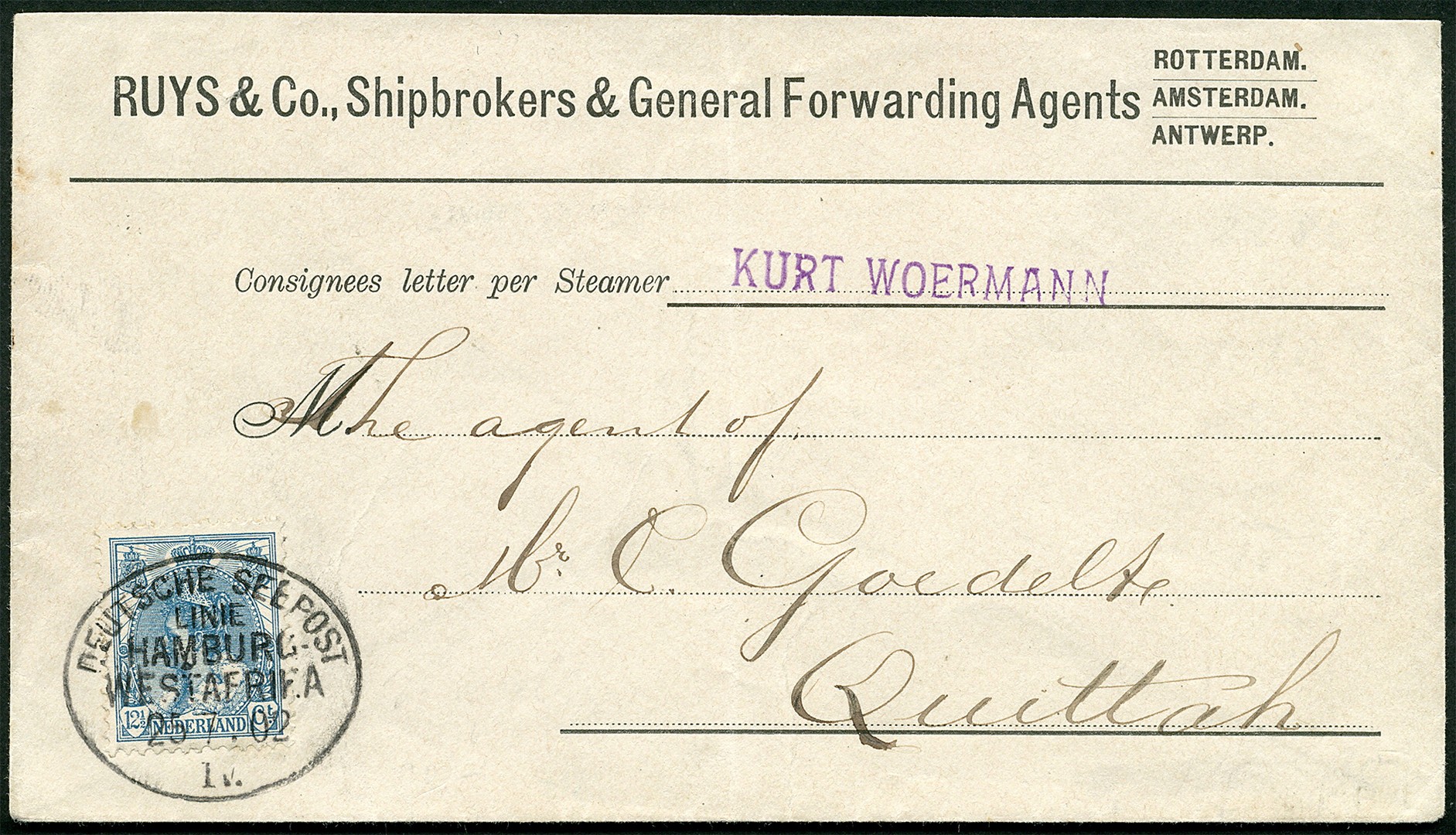 Firmacouvert van Ruys & Co te Rotterdam gefr. met 12½c Bontkraag afgest. met ovaalstempel ´Deutsche Seepost/Linie/Hamburg-/Westafrika/IV.´ op 25-7-1902 per ´Kurt Woermann´ naar Quittah = Kwitta in de Goudkust 15-8. Zeldzaam!