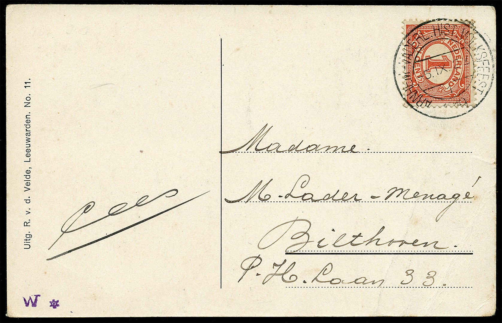 ARNHEM-VADERL.HIST.VOLKSFEEST 1919. Prentbk. (Friesche Kleederdracht, hoekvouwtje) gefr. met 1c heel mooi afgest. met dit zeer zeldzame gelegenheidsstempel (vdWart II.30) op 5-9-1919 en verstuurd door Cees naar een madame